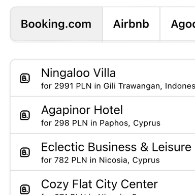 See details of each of your stays. Booking, AirBnB or Agoda and your Swarm checkins.